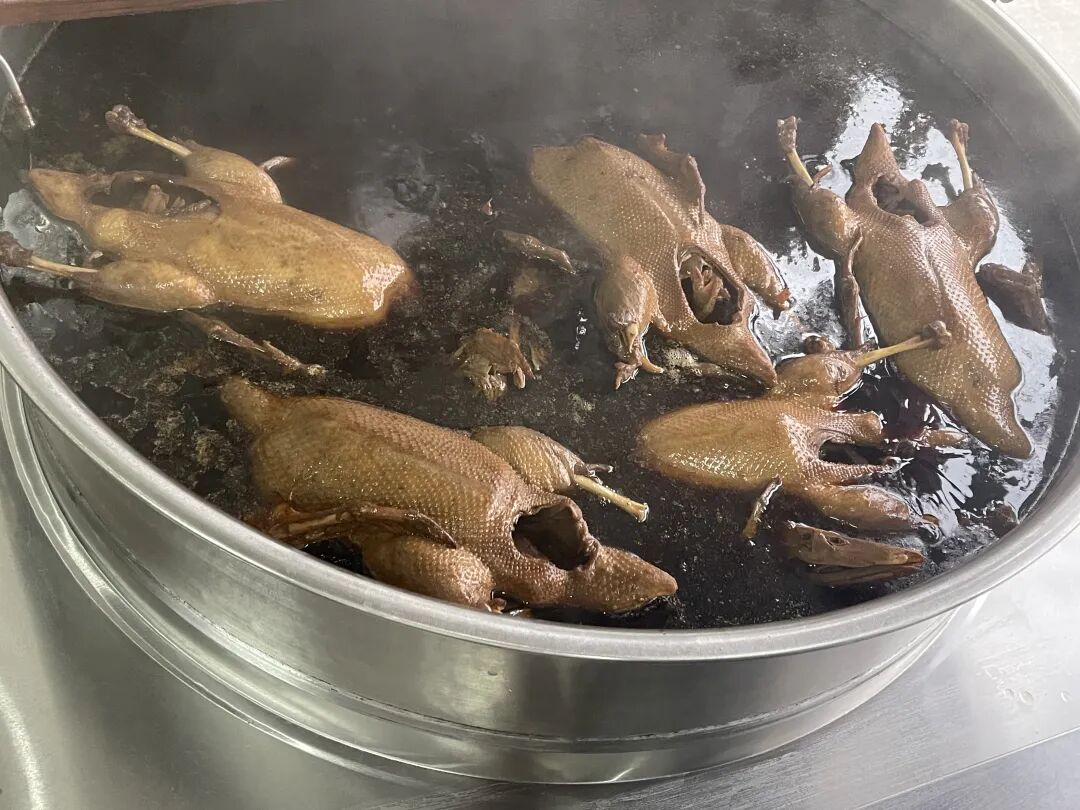 在他的店里,一口大锅不断冒着热气与香味,一只只色泽红亮的禹门卤鸭被他从锅中捞起。刚出锅的卤鸭,表皮泛着诱人的光泽,卤香浓郁却不腻。要把新鲜的麻鸭制作成诱人的卤鸭,中间的过程可是相当讲究。据刘世鸿介绍,首先要对麻鸭进行细致的处理,把鸭子清洗干净,用盐腌一会后再清洗一次。然后,便是关键的卤制环节,他将祖传秘方与传统工艺结合,用几十种中药经过精心配比,调出独特的卤汁味道。然后将处理好的麻鸭放入卤汁中,卤制2小时,让卤汁的味道渗透到鸭肉里。这一过程需要耐心和经验,火候的掌握十分重要。既要让麻鸭在卤汁中充分吸收味道,又要让鸭肉鲜嫩多汁、香气四溢。